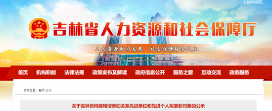1月7日,吉林省人力资源和社会保障厅网站发布《关于吉林省构建和谐劳动关系先进单位和先进个人拟表彰对象的公示》。