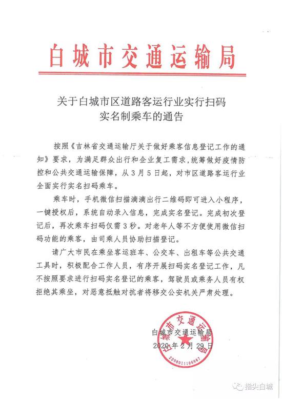 按照《吉林省交通运输厅关于做好乘客信息登记工作的通知》要求,为满足群众出行和企业复工需求,统筹做好疫情防控和公共交通运输保障,从3月5日起,对白城市区道路客运行业全面实行实名扫码乘车。