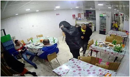 19时46分左右,在福隆狗肉馆就餐的两名男子。一名男子上身穿蓝色上衣,衣服后背带有“沃特”字样,下身穿黑色裤子;另一名男子身穿蓝色上衣,衣服左前胸带有“Xs”字样,下身穿牛仔裤。