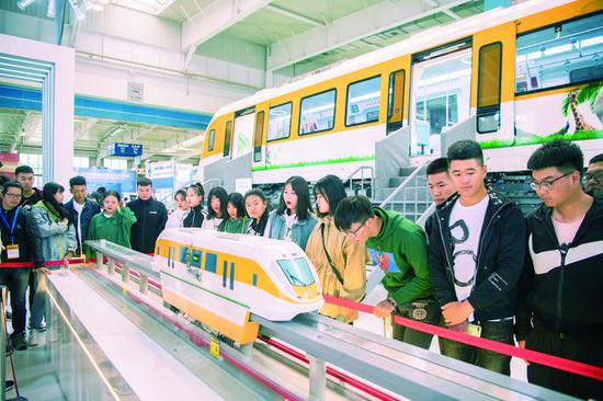 20日,第五届中国(长春)轨道交通博览会在长春国际会展中心开幕。由中车长春轨道客车股份有限公司研制的新一代中低速磁浮列车炫酷亮相。黄白相间的流线型车头,装饰热带植物与动物形象,集动感、可爱于一身,让参观者瞬间爱上这款列车。
