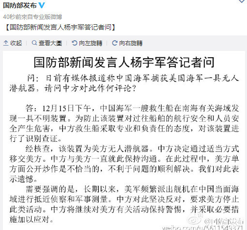 国防部回应捕获美潜航器:决定通过适当方式移交美方