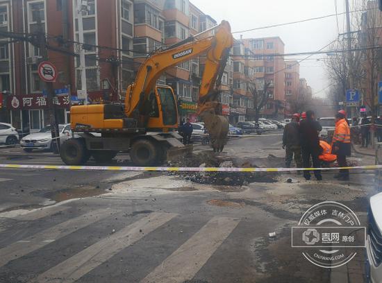 下午2时30分,吉网、吉刻APP记者赶往现场看到,甬道周边的积水已排空,两辆供热抢险车停靠在路旁,十字路口处已拉起了蓝色的警戒线,一辆挖沟机正在配合数名工作人员进行地下抢修工作,管线抢修机械的火花和热水的蒸汽不时闪现。