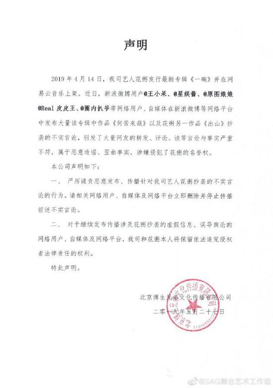 声明中写道,花粥于2019年4月14日发行并上架了最新专辑,但近日却有网络用户及自媒体在网上发布花粥作品抄袭的不实信息,引发大量网友转评。该言论与事实严重不符,属于恶意造谣,侵犯了花粥的名誉权。己方要求相关用户立即删除并停止传播不实传言,对于持续散播的人,己方将保留依法追责的权利。