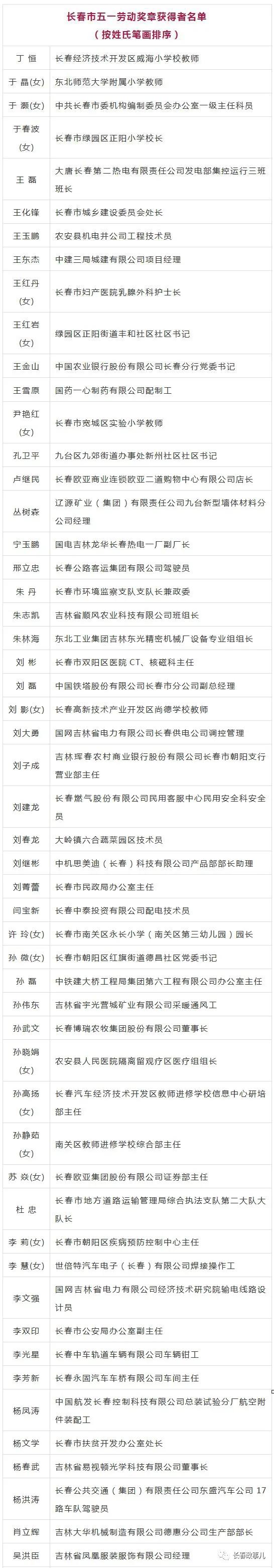 驰援武汉的长春市妇产医院乳腺外科护士长王红丹、始终奋战在防控一线的朝阳区红旗街道德昌社区党委书记孙微、快速响应保障民生供应的长春欧亚商业连锁欧亚二道购物中心有限公司店长卢继民、复工复产后加班加点抢工时的长春中车轨道车辆有限公司车辆钳工李光星……2020年长春市五一劳动奖章奖状评选在继续面向基层、面向一线、面向普通劳动者的基础上,优先考虑抗击疫情中在医疗救护、科研攻关、基础预防、应急医疗药品及防护用具生产、服务保障民生、促进复工复产等方面作出突出贡献的个人和集体。