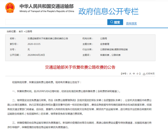 交通运输部:5月6日零时起 全国收费公路恢复收费