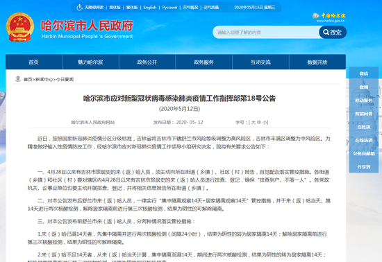 哈尔滨:对舒兰来(返)哈人员,一律实行“14+14”隔离观察