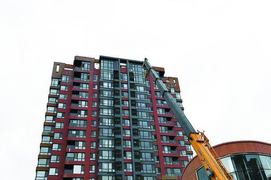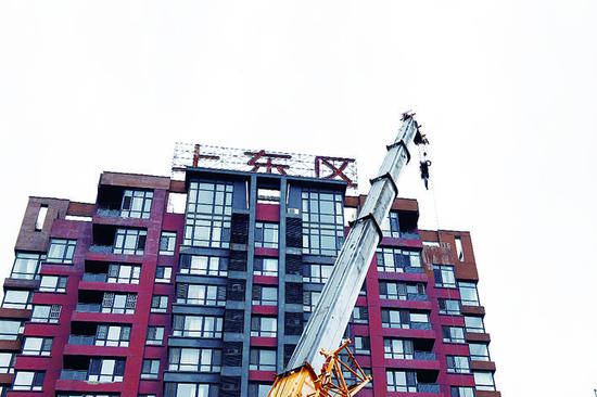 20日,在位于经纬南路的万科上东区小区,一辆大型吊车挥动着“手臂”,配合楼顶施工人员将立于18楼的“上东区”三个大字拆除。