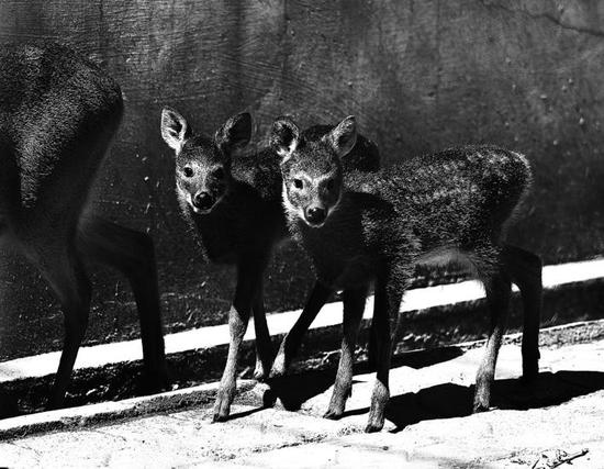 在吉林省野生动物救护繁育中心,两只出生10多天的河麂宝宝第一次走出圈舍,好奇地瞪大眼睛打量外面的世界。它们是我国首次成功繁育的河麂高丽亚种。河麂爸爸悠闲地埋头吃着榆树叶,不时露出两只尖利的上犬齿。河麂妈妈对于人类的接近显得很紧张,它迅速在两个宝宝身边跑来跑去,还经常蹿跳着,从两个小宝宝头上跃过。自从河麂宝宝出生后,妈妈一直小心地把它们藏在圈舍深处,不让人靠近。