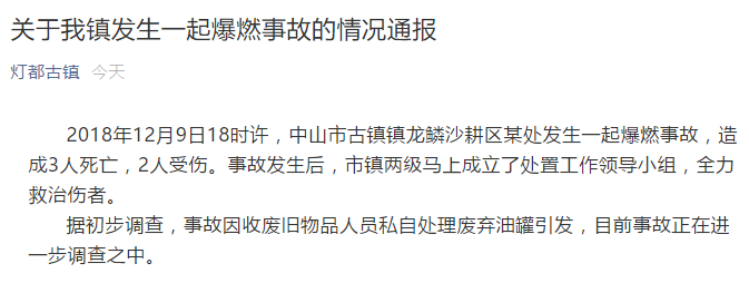 新京报快讯 据中山市古镇镇宣传文体服务中心官方微信消息,2018年12月9日18时许,中山市古镇镇龙鳞沙耕区某处发生一起爆燃事故,造成3人死亡,2人受伤。事故发生后,市镇两级马上成立了处置工作领导小组,全力救治伤者。