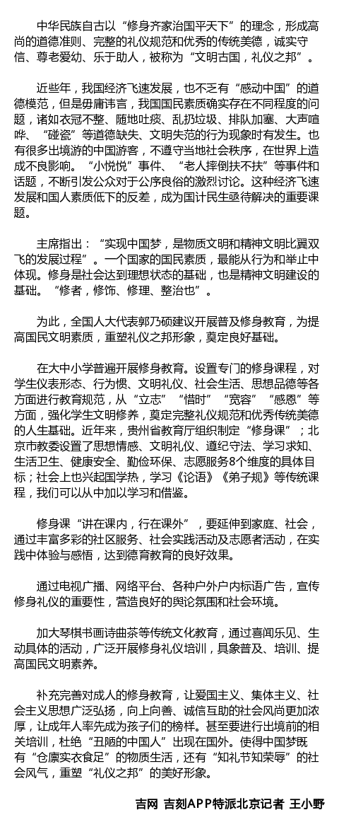 人大代表郭乃硕建议:普及修身教育重塑礼仪之邦形象