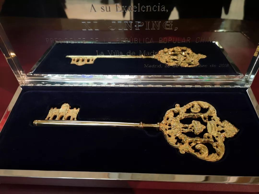 没错,这就是马德里城市金钥匙。钥匙尾部是马德里市徽上的“树莓和熊”,齿部是马德里地标建筑阿尔卡拉门。11月28日,马德里市长卡梅纳代表马德里全体市民把它赠送给习主席,表达对远道而来的中国贵宾的尊重和敬意。