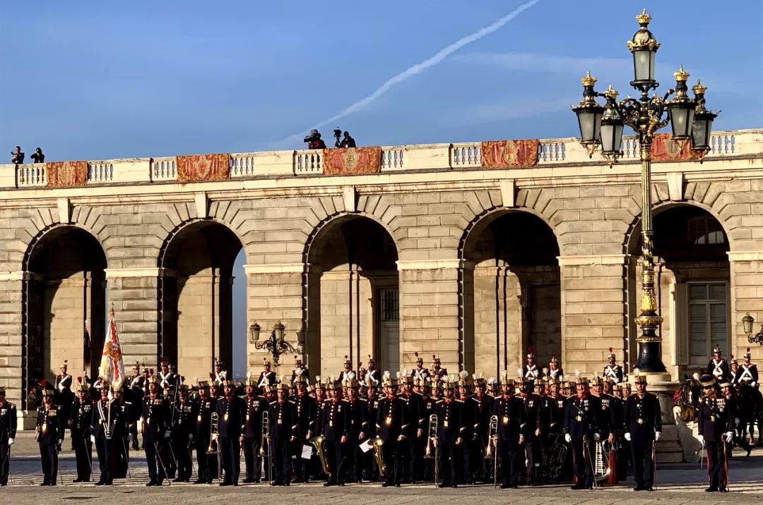 21响礼炮,皇家卫队骑兵护卫,摩托车队、军乐队、步兵方队、骑兵方队……尽显西班牙欢迎外国元首的最高规格。