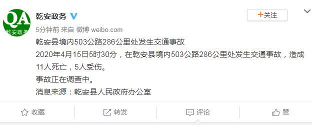 据吉林省松原市乾安县互联网信息中心官方微博消息,2020年4月15日5时30分,在乾安县境内503公路286公里处发生交通事故,造成11人死亡,5人受伤。