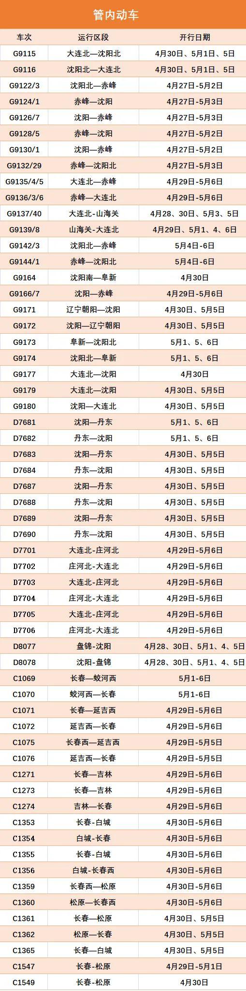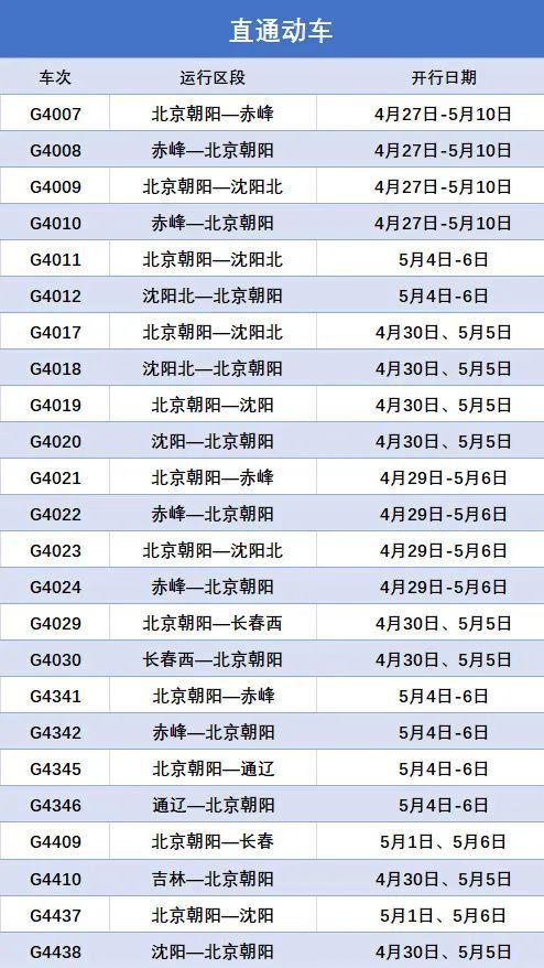 为满足旅客五一小长假出行需求,沈阳局集团公司优化调整运输方案,从4月27日起北京、赤峰、大连、长春等方向,陆续加开多趟旅客列车,赶快来看看都有哪些车次。