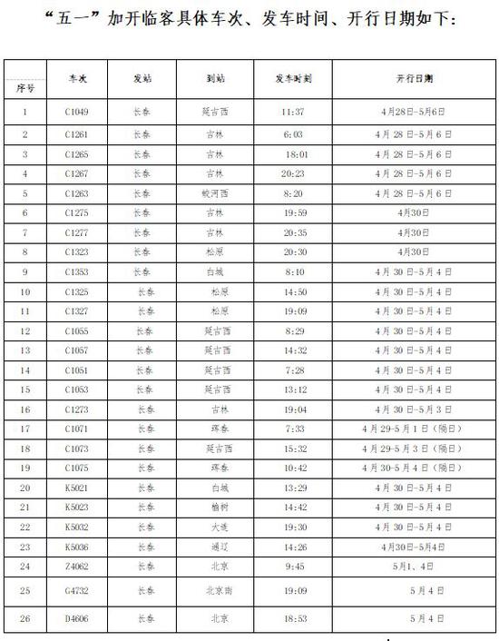 根据节假日旅客运输特点,提前计划加开列车。今年“五一”小长假期间,长春站预计发送旅客67.5万人,日均13.5万人。为了方便“高铁+旅游”出行的旅客,即日起至5月4日加开吉林、延吉西、蛟河西、松原、榆树、大连、通辽、白城、珲春、北京方向的临时旅客列车26列。