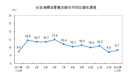 15日,在国家统计局网站看到,2018年1-2月份,社会消费品零售总额61082亿元,同比名义增长9.7%。其中,限额以上单位消费品零售额23242亿元,增长8.3%。