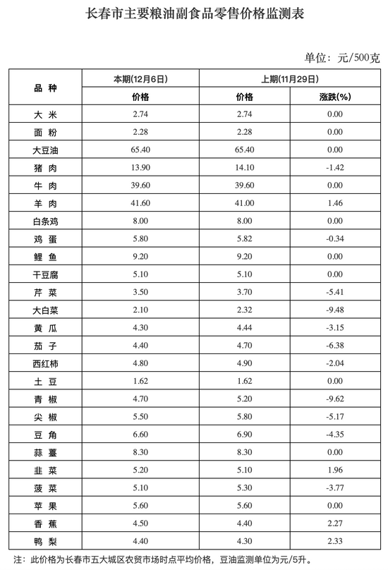 据监测数据显示,长春市重要生活必需品市场货源储备充足、流通渠道畅通,完全可以满足市民的消费需求。与上周一(11月29日)相比,12月6日粮油和副食品价格基本稳定,蔬菜价格以降为主,水果价格小幅上涨。
