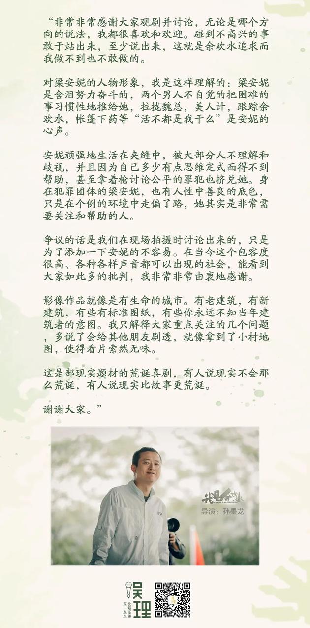 《我是余欢水》争议台词发稿之前,娱理工作室再次联系孙墨龙导演,面对争议,他给出了正面回应。