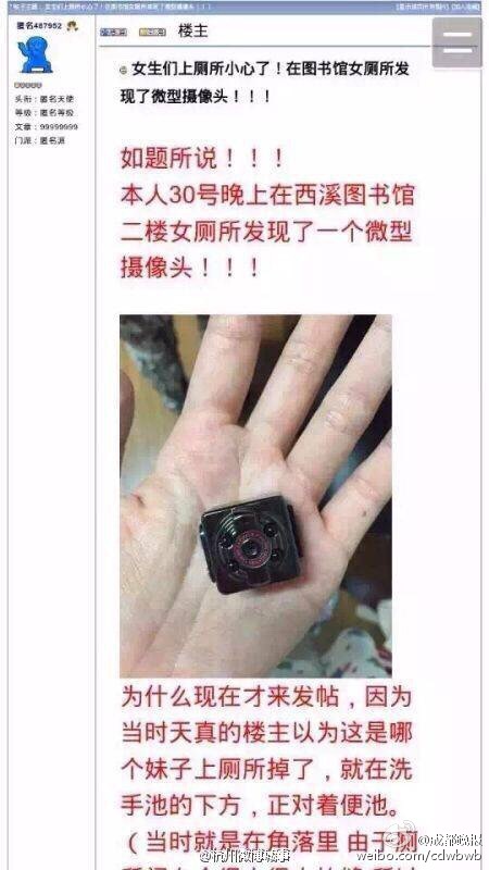 发帖的女生称,5月30号她在浙大西溪校区图书馆二楼的女厕所,发现了一个微型的摄像头。