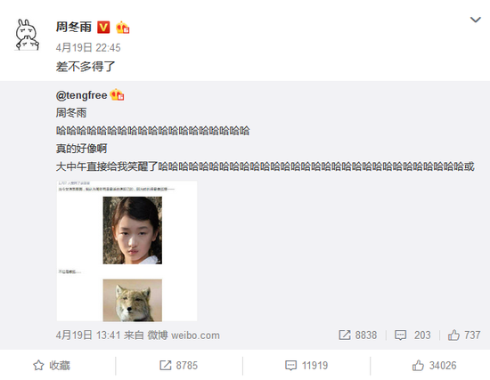 新浪娱乐讯 4月19日,有网友在微博晒出一张某问答网站的截图,图中某网友回答了“当今女演员谁最适合演妲己”这一问题,称周冬雨最适合,因为“她长得最像狐狸,不过是藏狐”;随后,周冬雨转发了这条微博开玩笑道:“差不多得了”。