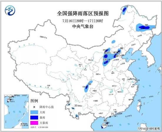 中央气象台7月16日18时继续发布暴雨蓝色预警,预计16日20时至17日20时,山西中北部、河北中部、北京、内蒙古中部和东北部、黑龙江南部以及四川盆地西部、广东西部沿海、海南岛等地的部分地区有大到暴雨,局地大暴雨(100~130毫米),最大小时降水量30~50毫米,局地70毫米以上。