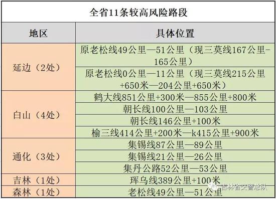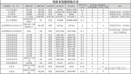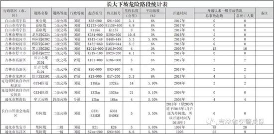 其中高风险路段主要分布在我省东部山区,多为急弯,临水临崖道路;在长大下坡危险路段行驶,驾驶人频繁刹车容易出现制动失灵,兰海高速甘肃兰州南收费站发生的“11.3”交通事故正是因为连续长下坡行驶中,频繁制动导致制动失灵,车辆失控与收费站广场内车辆相撞;事故多发路段是指近3年内,高速公路1公里、普通公路500米范围内发生3起以上造成人员死亡交通事故的,或者高速公路4公里、公路2公里范围内发生2起以上一次死亡3人以上交通事故的路段,其中延边敦化G201国道K707+500-K707+600路段,两年内发生两起一次死亡3人以上交通事故。吉林省公安厅交警总队此次向社会公布的高风险路段、长大下坡危险路段和事故多发路段都是容易发生交通事故的危险路段路段,提示广大驾驶人行经这些路段时要注意行车安全。