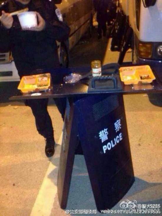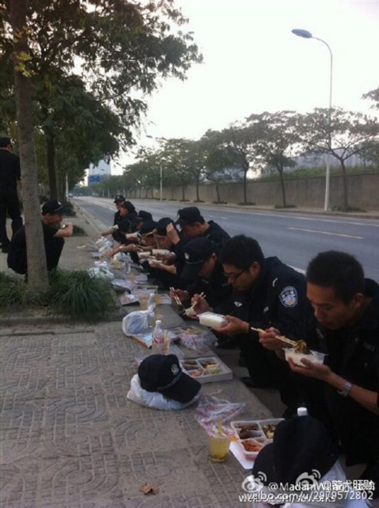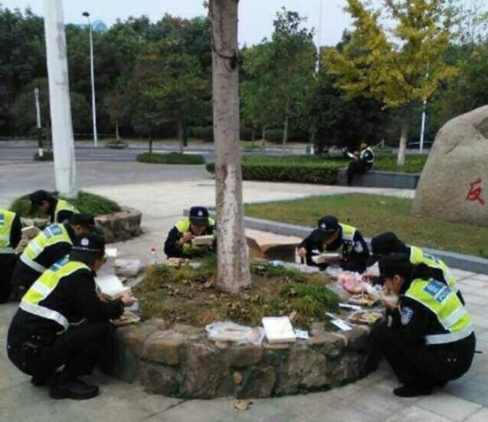 1月29日下午,武汉市公安局刑事侦查局警犬大队官方微博“警犬旺财”发布8张民警围坐吃地瓜、盒饭的照片。这条微博的评论呈现两种不同意见。有网 友说,为兢兢业业辛苦为大众服务的基层民警“点赞”,非常能理解基层民警的苦。更多的网友则表示,把底层警察的艰苦与高层官员的奢侈捆绑在一起,并不妥 当。图为该官微所发图片。