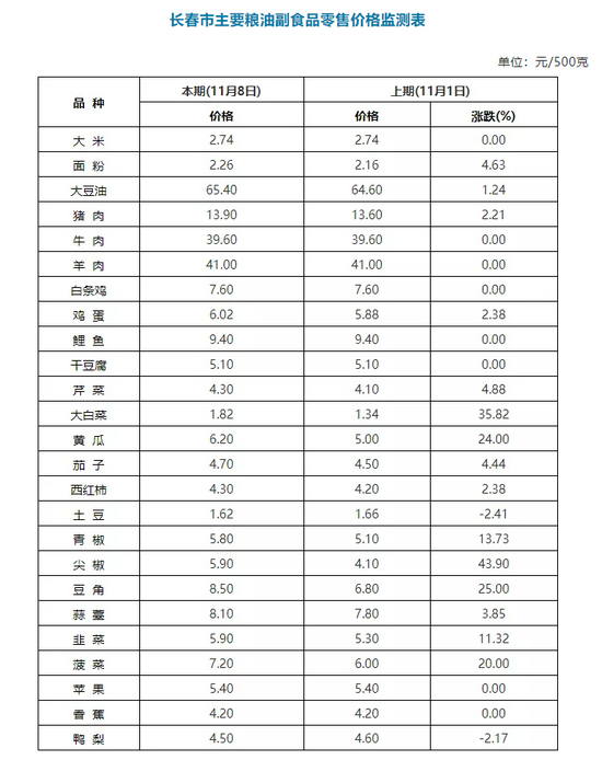 据监测数据显示,长春市重要生活必需品市场货源储备充足、流通渠道畅通,完全可以满足市民的消费需求。与上周一(11月1日)相比,11月8日粮油、猪肉和鸡蛋价格小幅上涨,其他副食品价格保持稳定,蔬菜价格以涨为主,水果价格平稳。