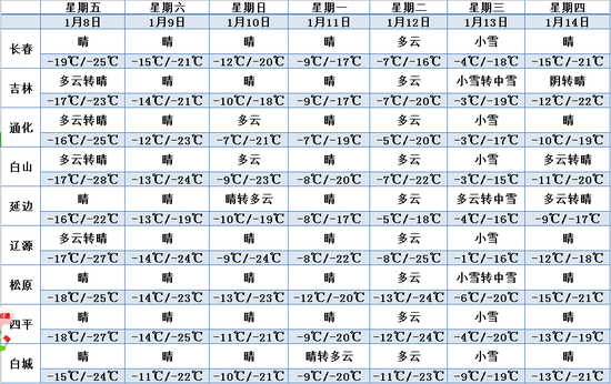 1月8日夜间到1月9日白天,吉林省晴。1月9日夜间到1月10日白天,吉林省晴。