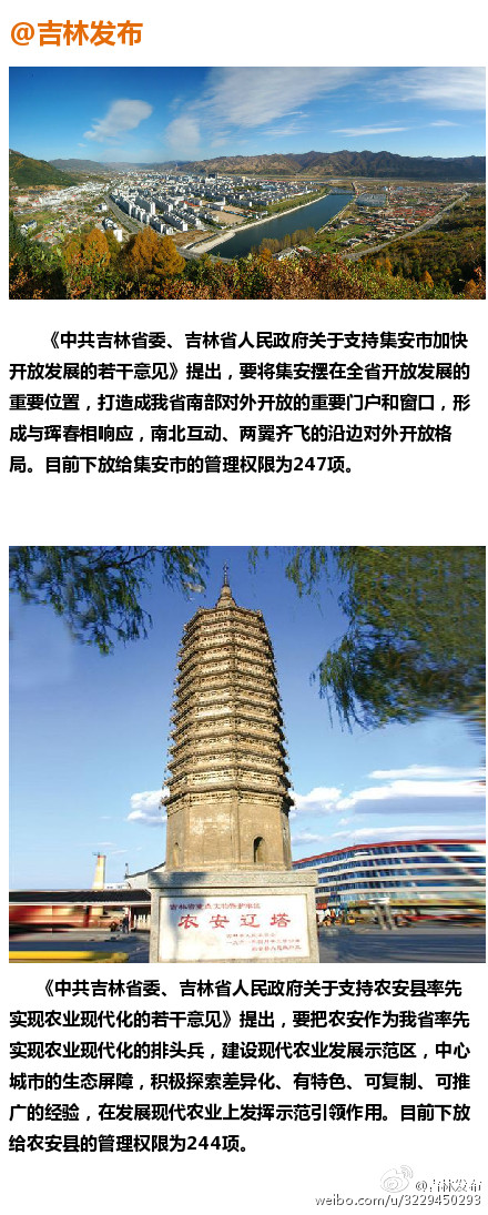 据@吉林发布 [我省将赋予农安县和集安市政府地级市政府经济社会管理权限]今天召开的省委全面深化改革领导小组第十六次全体会议通过了关于《支持集安市加快开放发展的若干意见》和《支持农安县率先实现农业现代化的若干意见》。据悉,将下放给集安市的管理权限为247项,下放给农安县的管理权限为244项。