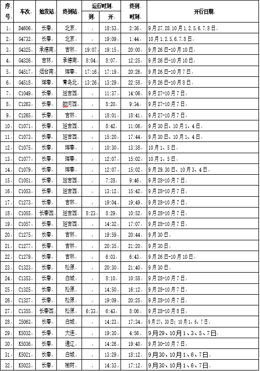 为方便节日期间市民出行需求,长春站加开延吉西、松原、白城、榆树、大连、通辽、吉林方向临客32列(具体车次附后),29趟动车组重联运行。