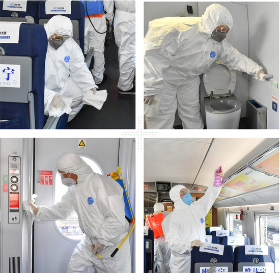 在列车上,安排专人每隔2小时为务工人员进行体温检测,每隔3小时对车厢进行一次卫生消杀,对门把手、水龙头、卫生间等共用设施随时消毒,并给每名旅客发放防控知识宣传手册。同时,车上还预留了防疫隔离区,认真做好车上防控各项应急准备。