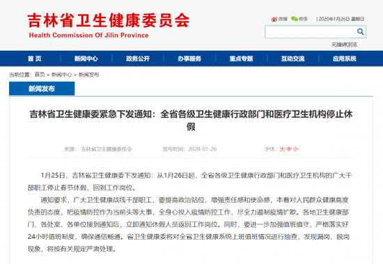 1月25日,吉林省卫生健康委下发通知:从1月26日起,吉林省各级卫生健康行政部门和医疗卫生机构的广大干部职工停止春节休假,回到工作岗位。