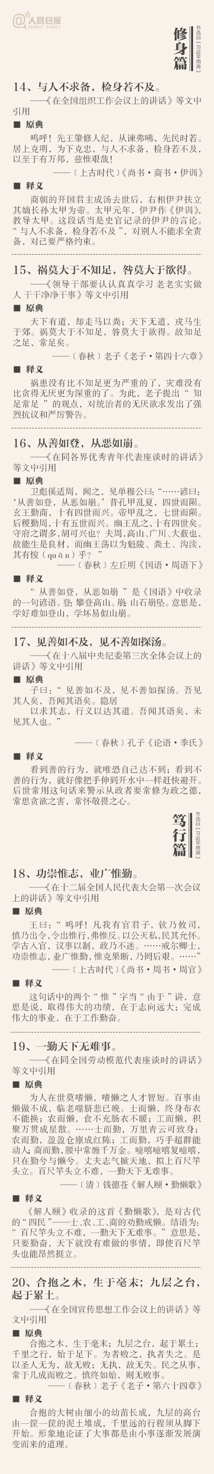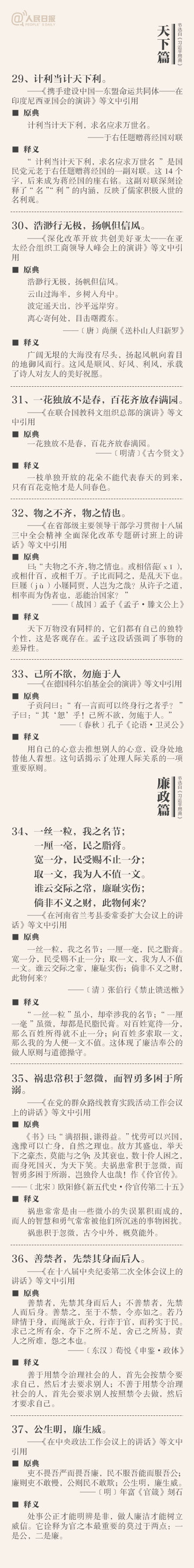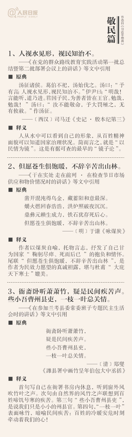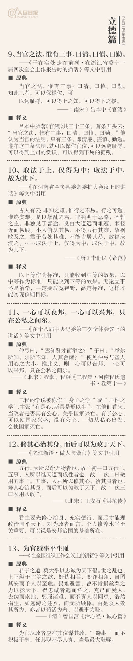 ①敬民:但愿苍生俱饱暖,不辞辛苦出山林;②立德:一心可以丧邦,一心可以兴邦,只在公私之间尔;③劝学:吾生也有涯,而知也无涯;④廉政:公生明,廉生威…这些你都了解吗?今天上午,《习近平用典》一书在人民日报社首发。摘自书中的50个典故↓↓