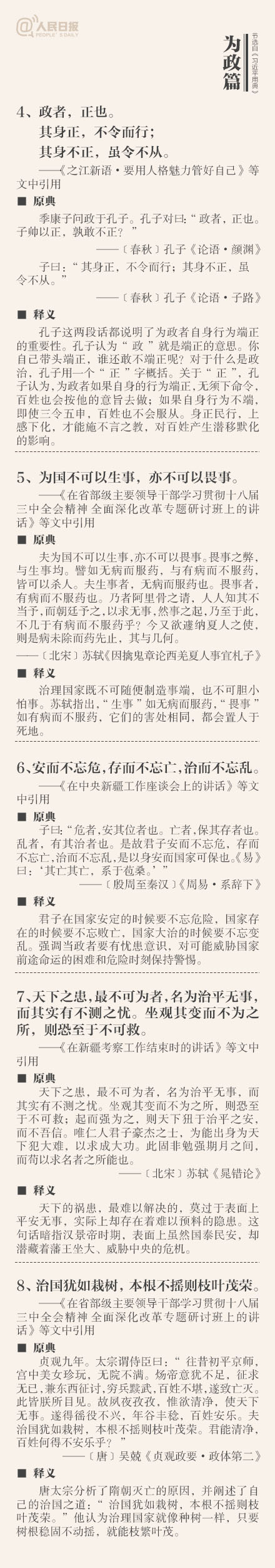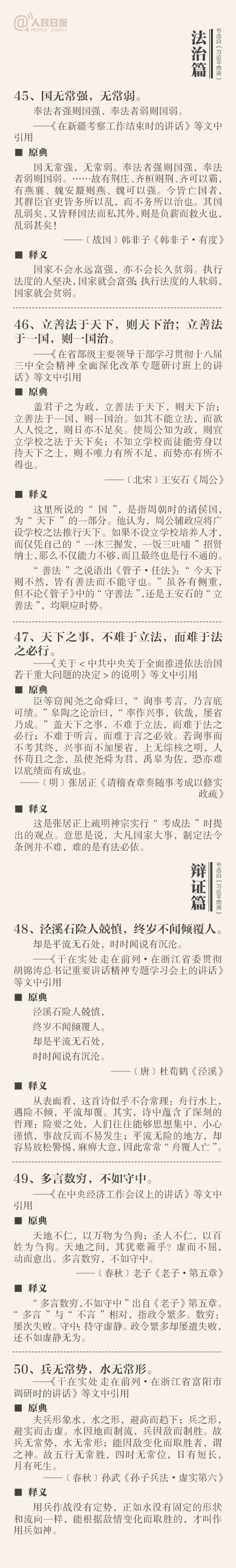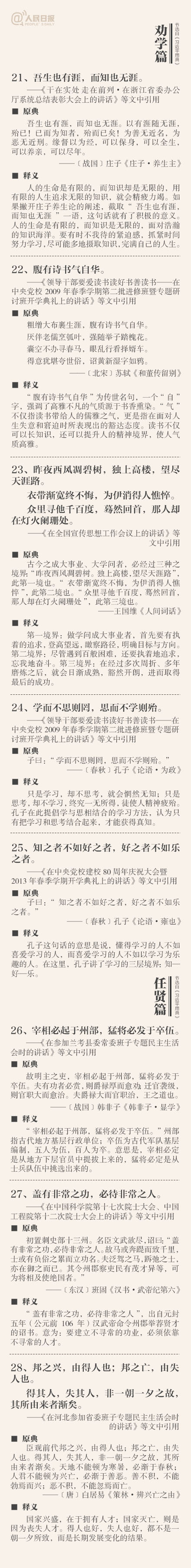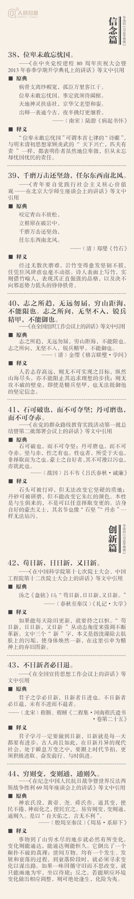 ①敬民:但愿苍生俱饱暖,不辞辛苦出山林;②立德:一心可以丧邦,一心可以兴邦,只在公私之间尔;③劝学:吾生也有涯,而知也无涯;④廉政:公生明,廉生威…这些你都了解吗?今天上午,《习近平用典》一书在人民日报社首发。摘自书中的50个典故↓↓