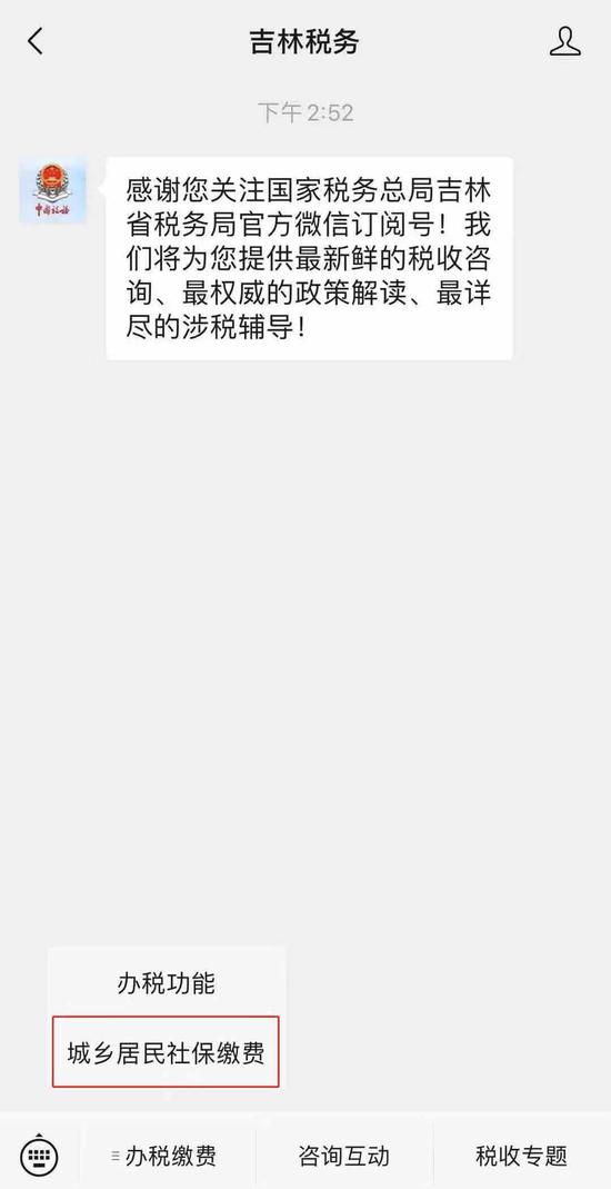 扫描“吉林税务”二维码关注,进入主页面菜单,点击网站专题——城乡居民社保缴费: