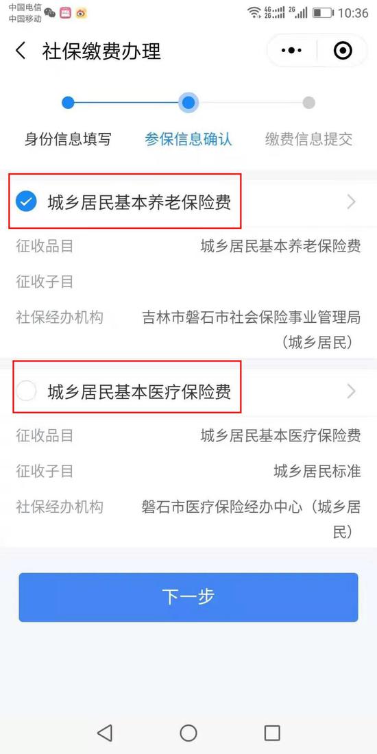 点击下一步,跳转页面,确认参保信息。同时参保城乡居民基本养老保险和医疗保险的缴费人,请注意选择您想要缴纳的险种: