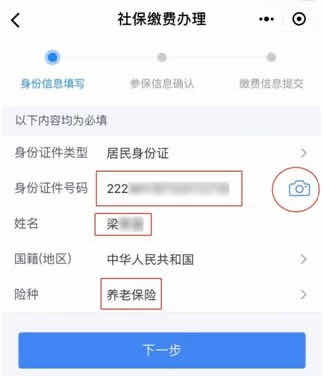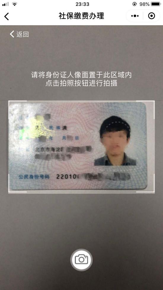 在信息填写页面,手动填写姓名、身份证号,也可无需填写,点击照相机按钮,用手机拍摄身份证,自动识别出个人信息: