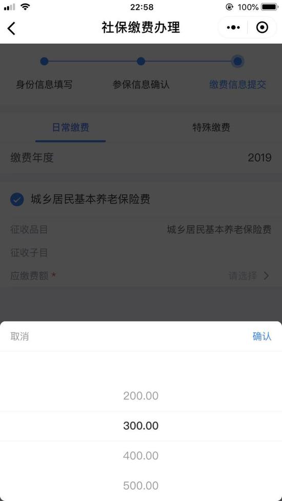 缴纳城乡居民基本养老保险的,请选择险种档次金额,提交缴费信息:
