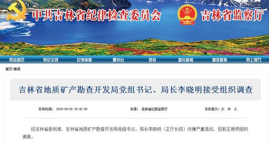 经吉林省委批准,吉林省地质矿产勘查开发局党组书记、局长李晓明(正厅长级)涉嫌严重违纪,目前正接受组织调查。