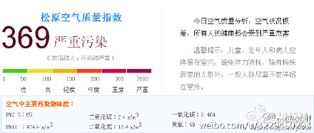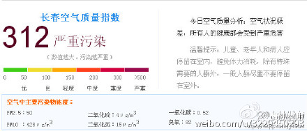 据@吉林省人民政府新闻办公室官方微博 报道 【大风预警,空气质量严重污染!】 #温馨提示# 此刻,我省多地出现大风沙尘天气,空气质量严重污染,省城长春笼罩在一片黄沙弥雾中。省气象台发布大风蓝色预警,小朋友们、老年朋友们还是宅在家里吧,外出别忘了戴口罩哦。