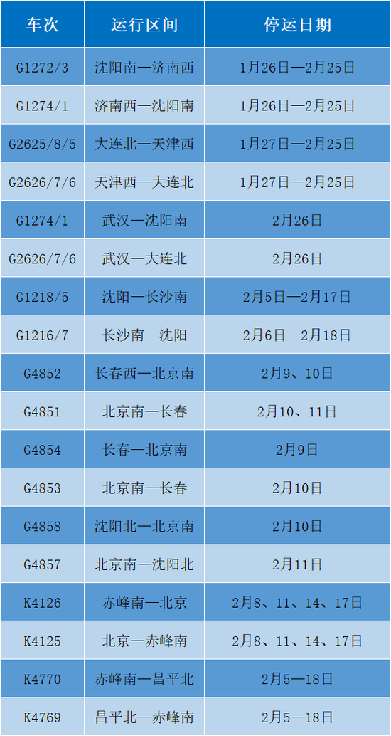 自1月28日起,沈阳局集团公司,根据旅客出行需求变化,调整优化列车开行方案,对部分旅客列车采取临时停运措施。