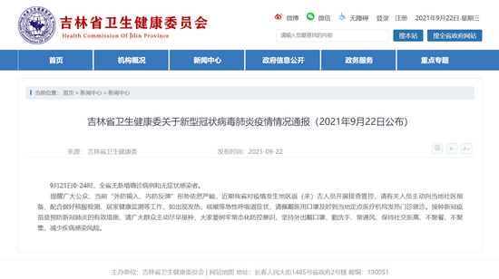 9月21日0时-24时,吉林省无新增确诊病例和无症状感染者。