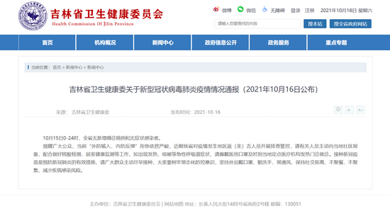 10月15日0时-24时,吉林省无新增确诊病例和无症状感染者。