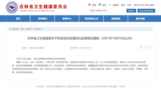 10月17日0时-24时,吉林省无新增确诊病例和无症状感染者。