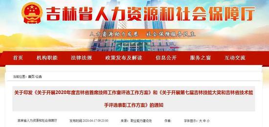 4月17日,吉林省人力资源和社会保障厅印发《关于开展2020年度吉林省首席技师工作室评选工作方案》和《关于开展第七届吉林技能大奖和吉林省技术能手评选表彰工作方案》的通知。决定开展2020年度吉林省首席技师工作室评选工作和第七届吉林技能大奖、吉林省技术能手评选表彰工作。