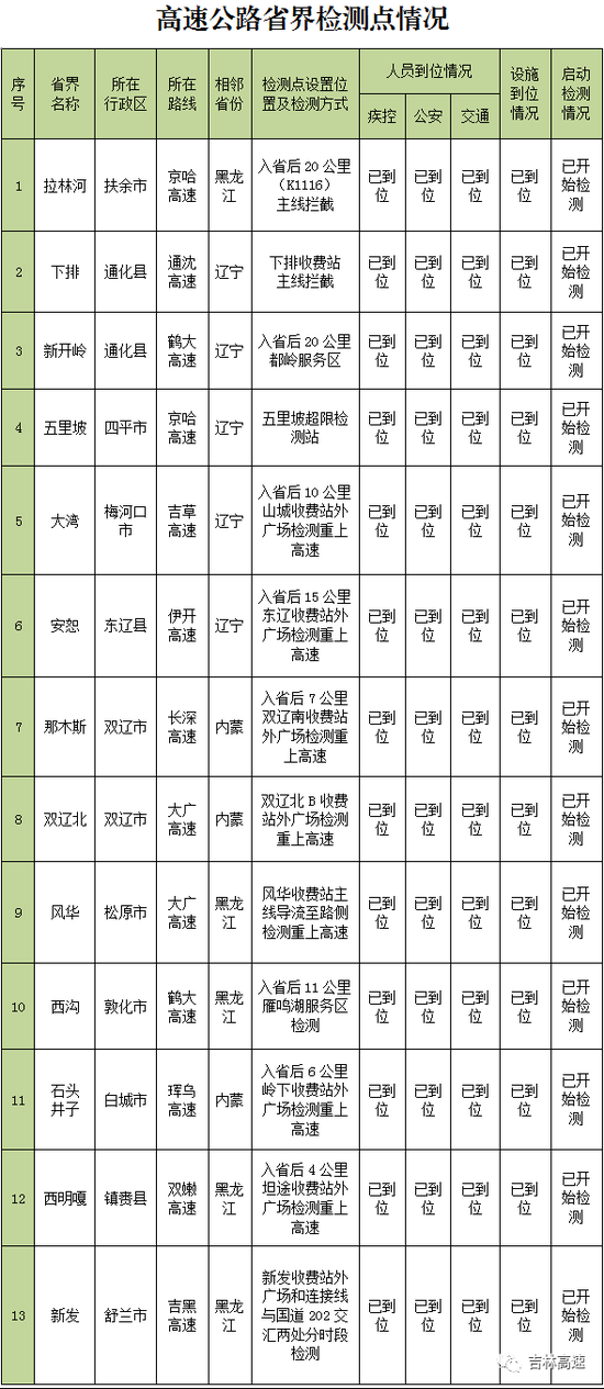 吉林省高速公路收费站开放、关闭及省界检测点情况汇总