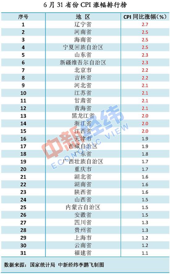 31个省份中, CPI同比涨幅不低于2%的有15地,分别为辽宁、河南、海南、宁夏、山东、新疆、北京、吉林、河北、江苏、甘肃、青海、黑龙江、浙江和江西,较5月份增加6个。CPI同比涨幅处于“1时代”的有16地,没有省份涨幅低于1%或高于3%。