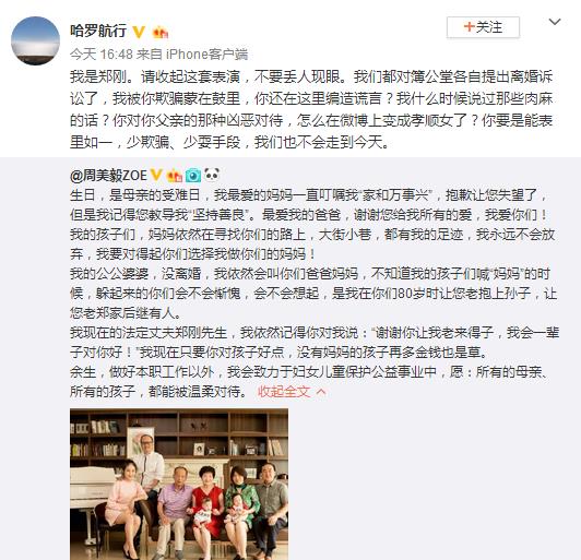 6月6日是周美毅的生日,她发文感慨“生日是母亲的受难日”,她还喊话郑刚父母“我的公公婆婆,没离婚,我依然会叫你们爸爸妈妈,不知道我的孩子们喊‘妈妈’的时候,躲起来的你们会不会惭愧,会不会想起,是我在你们80岁时让您老抱上孙子,让您老郑家后继有人。”她还提到郑刚,“我依然记得你对我说:‘谢谢你让我老来得子,我会一辈子对你好!’”这条微博引起郑刚不满,直指周美毅编造谎言,“我是郑刚。请收起这套表演,不要丢人现眼。我们都对簿公堂各自提出离婚诉讼了,我被你欺骗蒙在鼓里,你还在这里编造谎言?我什么时候说过那些肉麻的话?你对你父亲的那种凶恶对待,怎么在微博上变成孝顺女了?你要是能表里如一,少欺骗、少耍手段,我们也不会走到今天。”