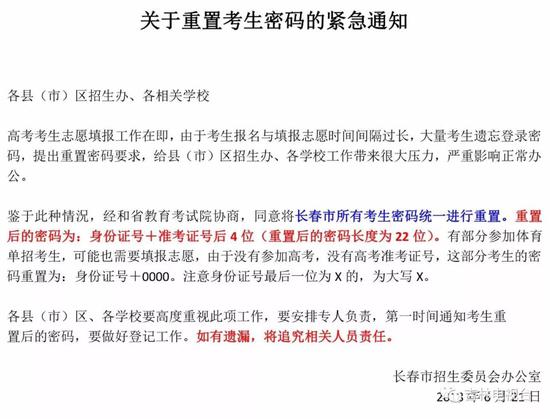 各县(市)区、各学校要高度重视此项工作,要安排专人负责,第一时间通知考生重置后的密码,要做好登记工作。如有遗漏,将追究相关人员责任。